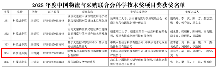 近期,由江苏J9国际站 J9特种装备有限公司与无锡J9国际站 J9桥梁科技有限公司共同申报的“SPMT模块车桥梁快速拆建技术的创新应用项目,凭借其卓越的技术创新性和显著的行业贡献,从全国上千个参赛项目中脱颖而出,一举斩获2025年度中国物流与采购联合会科学技术进步三等奖!