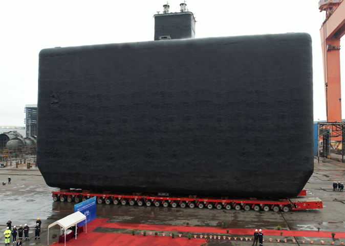 A型LPG液货舱长22米,宽45米,高31米,是专用于装载液化石油气的装置,单台LPG储舱结构重量约1600吨,总容积约23220m³,将这个“庞然大物”滚装上船,对运输各环节要求十分严苛。